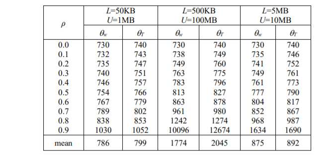 Table 2. Mean object size (θw, θT) for varying L and U when k =1.1, m=35, and C=10Mbps