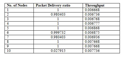 Table 1 shows the relationship between PDR and throughput. It can be seen from Table 1, throughput increases across all the nodes. Therefore, increasing the number of nodes increases throughput and vice versa. Thus, the average rate of successful packet delivery will improve with an increase in throughput.