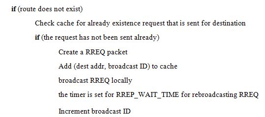 An example of message pseudo-codes sending RREQ is whenever a source wants to send the data, it broadcasts or floods the RREQ