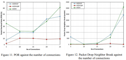 In Figure 12, the packet drop-neighbor break for AODVLBP is shown as having better performance. As the number of connections increases, there is a growing risk that certain links will be interrupted and a significant number of link failures will occur. Either the algorithm does not address that situation well, or further study is needed for the best alternative to be determined.Moderately well connected neighborhoods will have a small packet drop-neighbor break. As the number of connections grows, the packet drop rate increases steeply for both algorithms AODV and AODVLP. The inference here seems to be that the number of links (about 20 connections) that can be held is a certain upper limit. Once again, this presents a difficult problem to solve. The number of connections is a global parameter, so local adjustments to the routing algorithms will likely introduce only small (or zero) improvements.