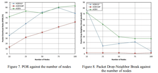 Figure 8 shows a significantly lower number of packet drop-neighbor breakings for AODVLBP, excluding the far left part of the diagram and a limited (10) number of nodes. One can infer that for a little number of nodes the efficiency gained by the link prediction algorithm is not needed since the total length of any path will be slight, and thus, will be discovered quickly. It is also imperative to observe that for large network size (100 nodes) the packet drop rate is almost near zero. This is a robust indication that AODVLBP converges. While the figure shows the AODV and AODVLP also converges, AODVLBP converges to a significantly better value.