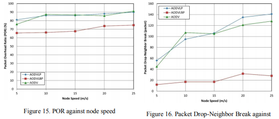 Figure 14 shows that all algorithms do well on the packet delivery ratio, but AODVLBP does slightly better when the node speed is low. This is undoubtedly related to the short path length.