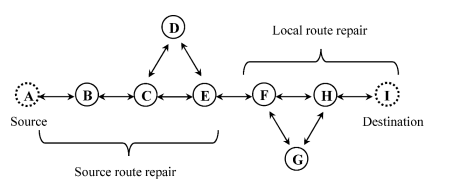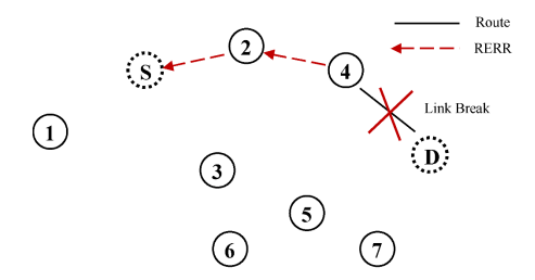 Figure 3 shows, for example, the local repair process when the connection between node 4 and node D has been disrupted. In this case, node 4 propagates a Route Error Packet (RERR), which contains addresses of the unreachable destination, to the source node. The routes which have an unattainable destination node that is the RERR propagation node, are no longer visible and propagate the RERR once again. When the source nodes collect the RERR and the route rediscovered, the path to the destination node is equally invalid. [12].