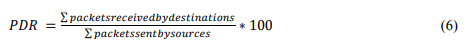 The PDR parameter is the total amount of data packets that the targets collect divided by the total number of data packets sent from the source. It is calculation demonstrates how a protocol moves packets successfully from the source to the destination. A high packet distribution ratio indicates positive results that reflect the routing protocol’s fulfillment and correctness. The delivery ratio for the packets is determined using the following formula: