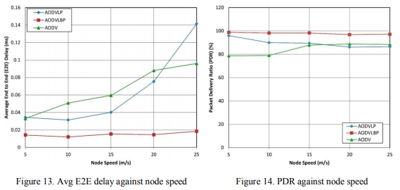 The average delay for the three algorithms is shown in Figure 13. AODV has a high end-to-end delay relative to AODVLP at low node speed. At the high node speed, AODVLP starts to perform worse than AODV. In general, for low and medium mobility, both AODV and AODVLP behave in approximately the same way. However, at a node speed of roughly 20 m/s, the AODVLP algorithms begin to show worsening performance that increases sharply where the node speed increases. AODVLBP starts with better performance and keeps slightly change throughout the changing in the node speed.