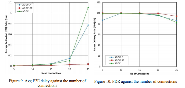 The number of connections varies from 5 to 25 to test the effect of the connection number on AODV, AODVLP and AODVLBP performance. As shown in Table 1, all simulation variables are set aside except the number of node sets at 10 nodes and node velocity sets at 5 m / s. The typical end-to-end interval in Figure 9 is almost functionally identical to Figure 5. Our algorithm obtained lower percentages in performance metrics of end to end delay. Figure 9 indicates that the total latency for end-to-end also reduces with increasing numbers of connections. The increase in the number of network connections allows further data packets to be re-routed to different paths and thus vulnerable to the breakage of the link.