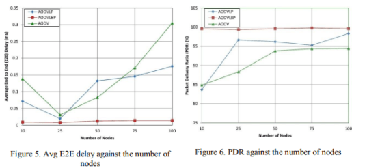 Several nodes with a packet delivery ratio are compared in Figure 6. For the packet delivery ratio, it can be noted that AODVLBP outperforms AODV and AODVLP at all network sizes and approaches near-perfect performance for large networks. This is a particularly important use case since reliable packet delivery in a large mobile network is a very common scenario. Notice alsom that AODV seems to have achieved convergence at a value of about 94%, and AODVLP achieved near to 97% while AODVLBP is close to 100%. This is a significant advantage for AODVLBP because it shows a measurable difference in the (undesirable) retransmission of dropped packets. AODVLBP drops almost no packets or minimized, while AODV drops small and AODVLP drops lower, but still measurable some packets dropping.