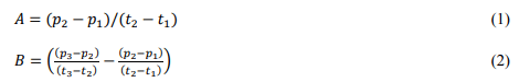 Note that we can use the same equations for both the original AODV and the modified AODVLBP. The symbols have a different meaning. In AODVLBP, the values of p and t are the values for the three most recently received packets and pris the threshold signal power. In ordinary AODV, such history may not exist, and therefore, it may be necessary to synthesize the history by the broadcasting of RREQ to get the data values. In other words, in AODVLBP, all p and t values are in the past, while in AODV, some might be in the future.