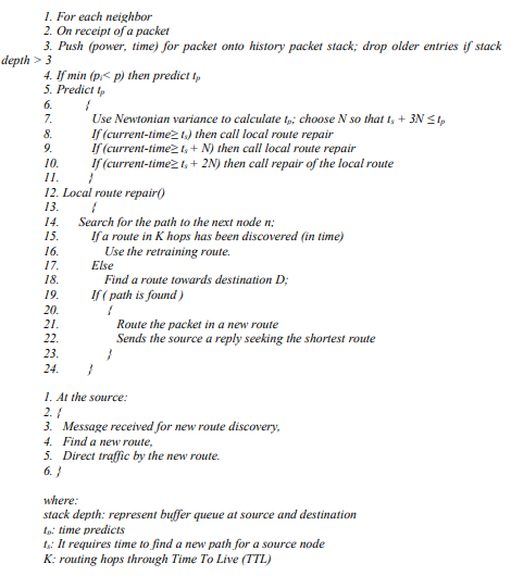 This section is mainly aimed at giving priority to link repair and/or link detection. To estimate the stability of a route consisting of multiple links, it is necessary to assess which links are likely to become unavailable. A very substantial part of the MANET algorithm is devoted to linking management and prediction [22]. The proposed algorithm was developed to estimate when the signal strength of a link will fall below some given threshold. This is used to imply that the two nodes in question move away. The link prediction algorithm acts as a proactive algorithm in that it warns that source that a new path must be found before the existing path has collapsed. This gives the node of origin the opportunity for path discovery while a current path is still in place. The examination phase will be held on each neighbor through whom three measurements “represent the received three last data packets with signal strength” for power and time will be acquired. Using the values of both measures, we can examine the state of the packet in fixed signal power. If the stack depth “represent buffer queue at source and destination” is higher than 3 degrees, an increment of the packet time and energy will be established to predict the time tp at fixed single power threshold p = 3.65×10-11 (used as an indication to predict the breakage in the link). However, if the time value obtained from the packet is equal to the critical juncture parameter ts for creating a new path, then calculate tp and call local route repair.
