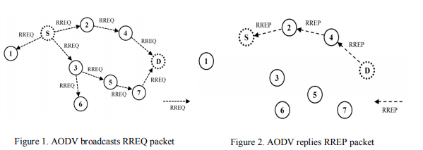 Figure 1 indicates the source node (S) that sends RREQ packets to its adjacent nodes over the network until the RREQ packet reaches the destination node (D). The destination (D), which replies to the source node using an RREP, is shown in Figure 2.