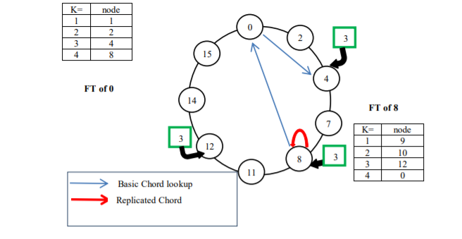 For example, in Figure 2, the responsible node of key=3 is 4. The latter has nodes 8 and 12 as finger nodes, so key 3 also replicated in these nodes (8, 12).