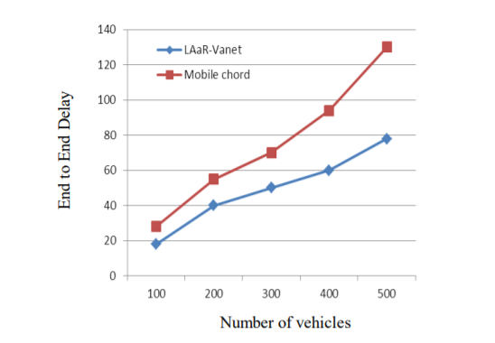 We study the lookup success rate when the number of vehicles varies from 100 to 500. The results are clarified in Figure. 6. In Figure 6, it can be observed that the lookup success rate generated by LAaR-Vanet is higher than the derived from the mobile Chord. And they decrease as soon as the vehicle’s number increase, which is normal, these results prove the efficiency of the proposed method (LAaR-Vanet) in term of data availability.
