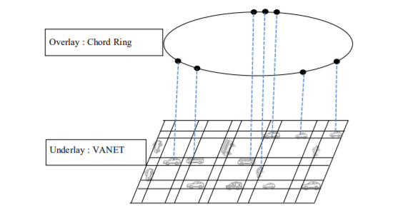 The authors use CAN as a peer to peer protocol. In their approach, roads are grouped into road sectors; each with a unique ID that is used as a key in the DHT; each sector has a vehicle responsible for all the data related to this section. The authors propose to keep the neighboring sections of roads close in the resulted overlay; this idea can be reached by replacing the hashing function with neighboring coordinates in the underlying topology.