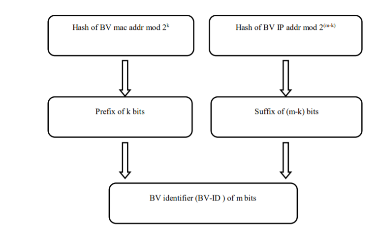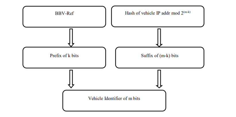 Vehicle_ID = hash(mac address of BBV)mod 2k + hash(ip address of Node)mod2m-k ( + denote the concatenation)