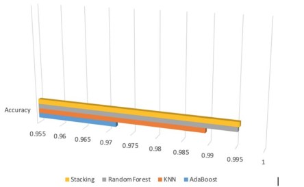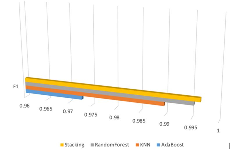 In Figure 9, the Recall of our proposed Stacking model is higher than KNN by 0.6%, AdaBoost by 2,2%, and Random Forest by 0.02% respectively. In Figure 10, F1 of our proposed Stacking model is higher than KNN 0,6%, compared to AdaBoost is 2,34% and with Random Forest is 0.03% respectively. We can see that with the NSL-KDD 2019 data set, for three individual ML models, RF gives the most accurate prediction results with the highest Precision. RF algorithms predict the best label compared to the remaining algorithms, and the higher Recall shows that Random Forest is also less likely to miss labels than the others. The reason might be when choosing the input parameter of the algorithm without considering the max depth parameter, Decision Tree constituting Random Forest will have the depth equal to the depth when browsing the tree with the ID3 algorithm [52] when each Decision Tree is reached. This reason makes Random Forest able to learn more deeply than others. With AdaBoost, we do not set the base_estimator parameter results in the algorithm using a training data set with Decision Tree with max_dept equal to 1. The base estimator from which the boosted ensemble is built that makes the algorithm much faster than Random Forest and provides lower accuracy but in the acceptable range compared to others. Finally, our proposed Stacking model provides significant improvements in Accuracy, Precision, Recall, F1-score which can be applied in practice with a very good performance. The increase in Accuracy indicates that our proposed model is more accurate than other individual models. Higher Recall shows that our model is less likely to miss labels.
