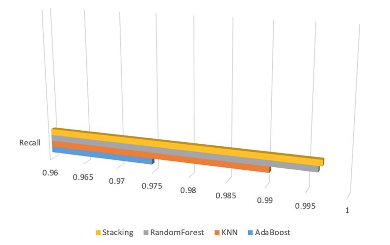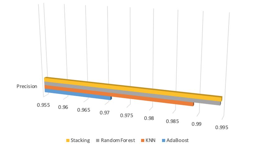 In Figure 7, the general accuracy obtained from our proposed Stacking model is higher than three individual machine learning algorithms. Accuracy of the proposed Stacking model is 0,6% higher than KNN, 2,5% for AdaBoost, and 0.03% for RandomForest respectively. In Figure 8, we can see that Precision is higher than KNN by 0,5%, AdaBoost by 2,4%, and Random Forest by 0,02% respectively.