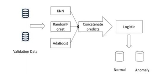 Proposed Stacking model: In Figure 2 is the illustration of our proposed Stacking model. In the model, Training and Validation data are inputs for the three machine learning algorithms which we apply KNN, RandomForest, AdaBoost. Y_pred_KNN is the predicted output from KNN, Y_pred_AdaBoost is the predicted output from AdaBoost and Y_pred_RandomForest is the predicted output of the RandomForest algorithm model respectively. In 2nd step, we combine the predictions of three algorithm models into one, we suppose following: