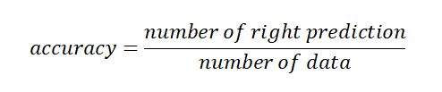 The simplest and most common performance metric is Accuracy. This metric simply calculates the ratio between the number of correctly predicted points and the total number of points in the test data set. The accuracy is calculated as the following: