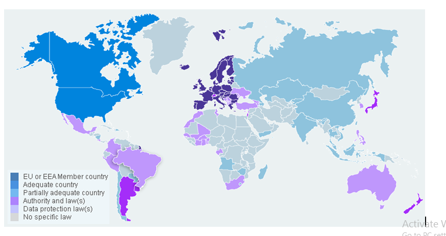 An LGPD will give the right to protection of the personal data of the respective holders and will give guidelines to the companies on how the treatment should be done. Brazil will be adapting to GPDR and will move the job market for data protection specialists. However, Brazil [20] already has a law for the creation of a supervisory body to verify whether companies comply with the LGPD, but directors have not yet been appointed to the National Data Protection Authority – ANPD and the National Council for Personal Data Protection and Privacy [20]. The European body responsible for supervising undertakings on whether they comply with the European Regulation is the European Data Protection Supervisor – EDPS, an independent supervisory authority established according to EU Regulation 2018/1725 [21], and its task is to ensure that the fundamental rights and freedoms of individuals – in particular their privacy – are respected when EU institutions and bodies process personal data. In the world, there are already some countries [22] [23] outside the EU that have a regulation regarding data protection. On the European Commission’s website, it informs countries that are at an appropriate level to the Regulation, the European Commission (figure 6) has recognized Andorra, Argentina [22] [23], Canada (trade organizations), Faeroe Islands, Guernsey, Israel, Isle of Man, Jersey, New Zealand, Switzerland, Uruguay [23] and the United States of America (limited to the Privacy Shield framework) as providing adequate protection [24].