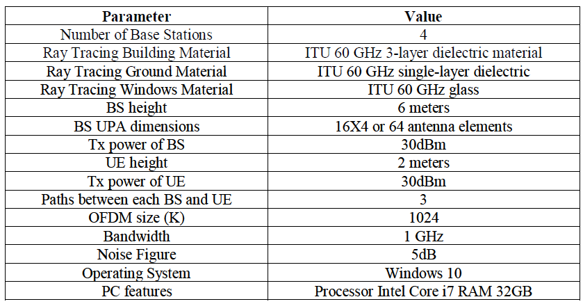 The dataset used in this paper is collected using the DeepMIMO [6] tool available online with the features explained below. The number of base stations can be selected from a list of 18 base stations available in the original simulation environment [6]. In our experiments, we selected only (4) of these base stations named (BS1, BS2, BS3, and BS4) distributed as in fig 2 and fixed on lamp posts. The distance between BS1 and BS3 equals the distance between BS2 and BS4 and equals 100m. The distance between BS1 and BS2 (across the street) equals to the distance between BS3 and BS4 and equals to 40m. Each BS has a height of 6m from the ground level [6]. Each BS is assumed to have a uniform planar array (UPA) of antennas that are facing the street. The grid of expected user locations starts from row number R550 and ends with the row number R1100 with each row having 181 users. The total number of expected users’ locations in a uniform grid that is being collected for the full fingerprint is (99731) location. Each user location will be collected by 4 BSs with each having 16X4 MIMO antenna arrays. Also, for each user, 3 paths of the signal between the user and each BS is collected (LoS and the strongest 2 NLos or 3 NLoS if there is blockage of the LoS path). First, the dataset is collected using MATLAB according to the simulation parameters listed above and in table 1 and the steps in [3]. After generating the dataset that will represent the inputs and outputs of the deep learning model, we use python to build, train, and test the deep learning model with different settings as we will see in the next section. To achieve that, we need Python 3.6 or later with Keras and Tensorflow libraries support. Finally, we used MATLAB again to process the deep learning outputs and generate the performance results and figures listed in the next section. More details about the simulation process are listed in the DeepMIMO official website [18].
