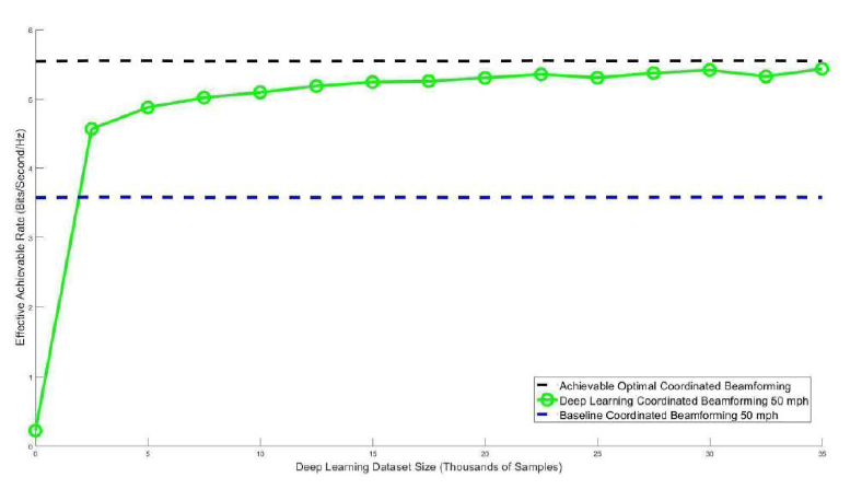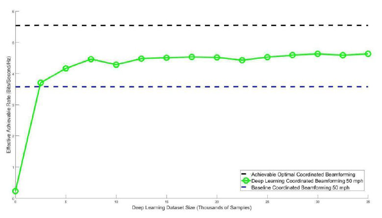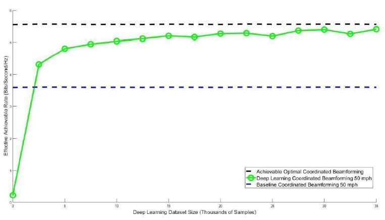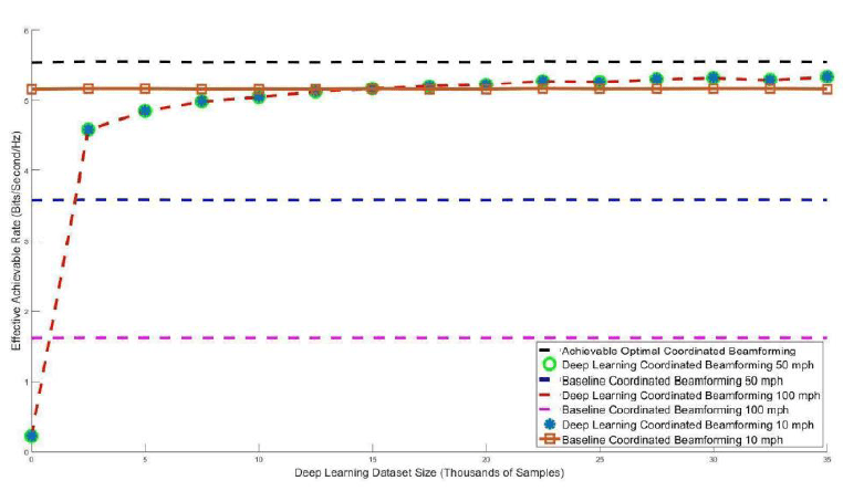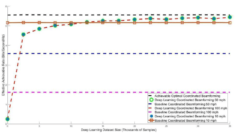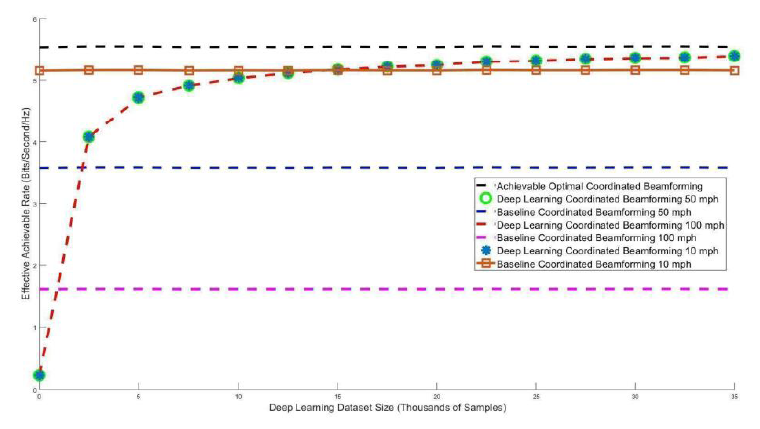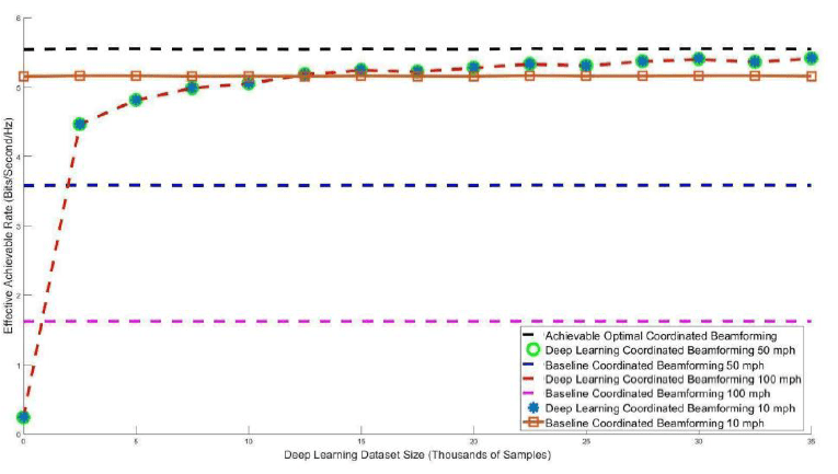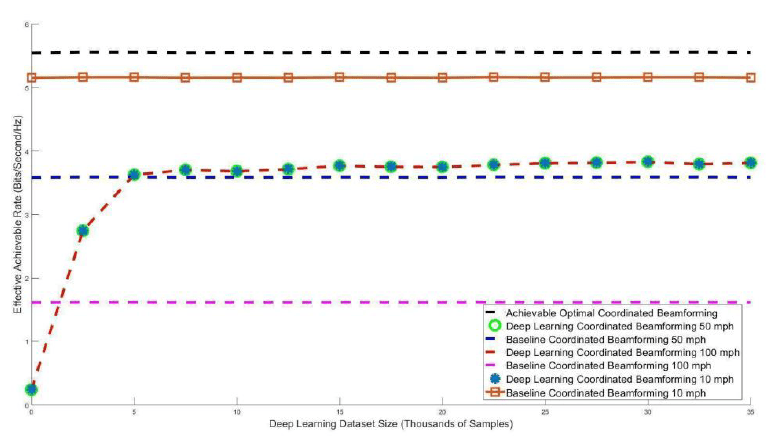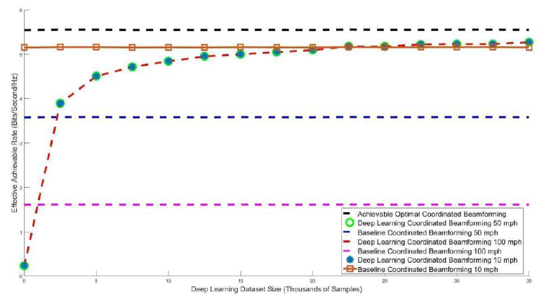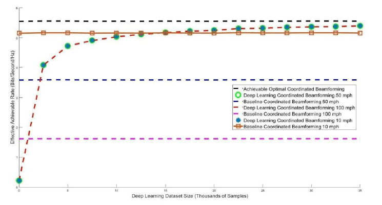 The first step in this work was to check the mobility speed effect on the performance of the system and we tried different speeds to check what would be the resulting spectral efficiency in (bits/sec/Hz). The figure (3) below shows that for different speeds (10, 50, and 100 mph), the deep learning network performance is almost the same and can still achieve a high system rate compared to the optimal genie-aided spectral efficiency. This means that the proposed network is stable for different mobility speeds and that it can be used for a wide range of mobile applications and scenarios.