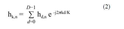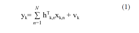 where: (xk,n) is the discrete time transmitted signal vector from the n-th BS at the k-th subcarrier, (hk,n) is the channel vector between the user and the n-th BS at the k-th subcarrier, and (vk) is the receive noise at subcarrier (k) defined as a normal distribution with a zero mean and (𝛔2) variance [3].