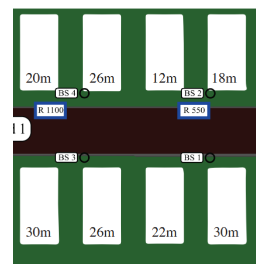 Figure 2. A top View of the street, buildings, and the Base stations distribution
