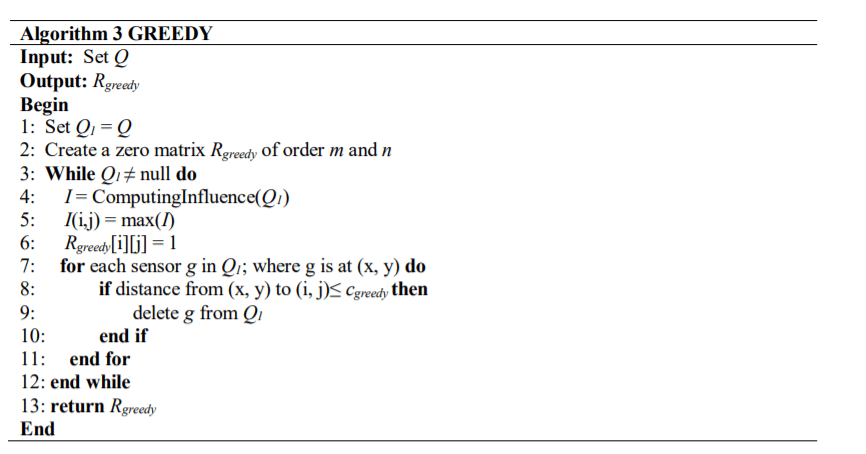 The GREEDY algorithm is an iterative algorithm. The input to this algorithm is Q, which is the set of all sensor nodes. In each iteration, it computes I using Computing INfluence. It then finds the maximum value in I. Let I[i][j] contains maximum value, it then updates with R[i][j] = 1 and deletes the sensor nodes which could be served by placing a RN at (i, j) before starting the next