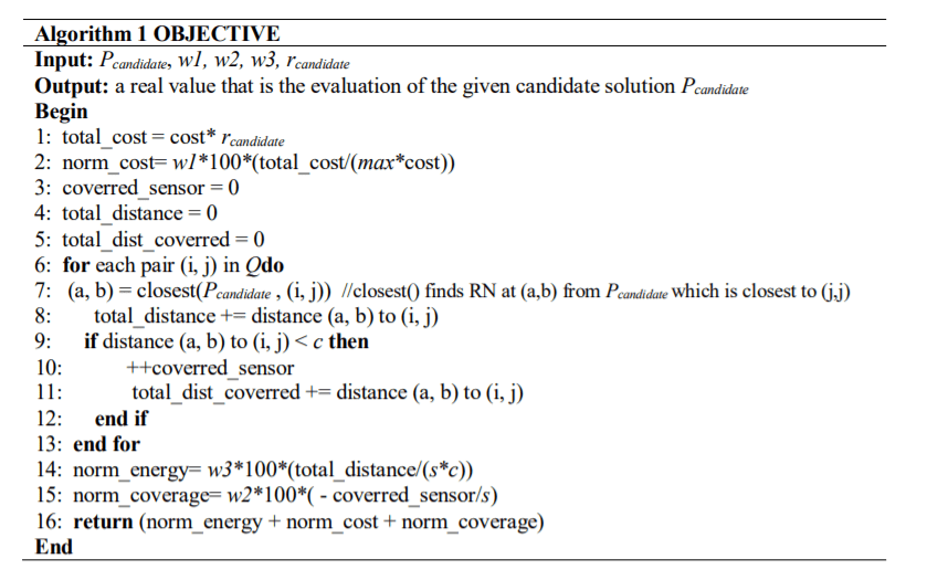 (i) Coverage: the fraction of sensor nodes that can communicate with at least one RN. This value is further multiplied with a weight factor w2. Let 𝑠′ be the number of sensor nodes that can communicate with at least any RN for a given solution. Then, the network coverage rate is computed as follows: