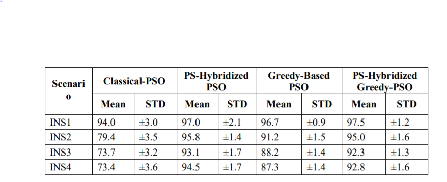In general, the performance of all the variants degraded as the network size increased in INS1- INS3. However, this was more adverse in the case of the classical PSO as the coverage rate decreased by more than 22% compared to less than 10% for the greedy-based PSO and hybridized greedy-based PSO. In terms of energy consumption, less degradation was experienced by greedy-based and hybridized PSO while the network became wider and denser. On the other hand, all the variants achieved quite a similar performance in INS3 and INS4 despite the increase in the size of INS4.