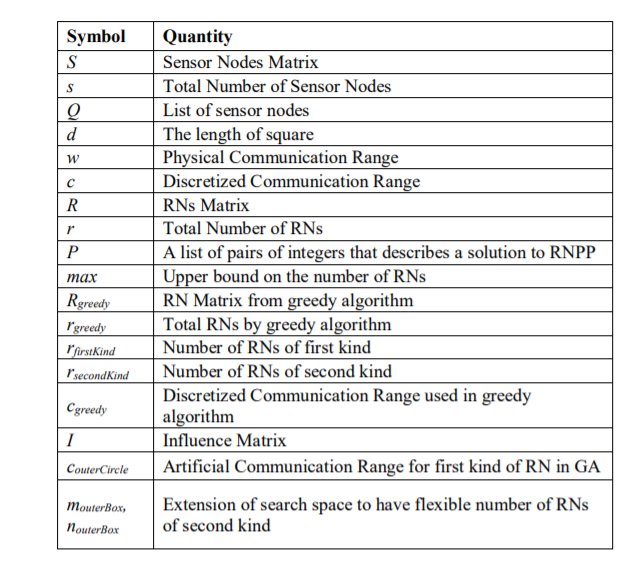 Table 2 list all the notations used throughout this section. Input to the RNP problem is a list of sensor nodes, each of which is described by a point. The list of points is drawn from a 2-D space. We will consider this as the search space associated with the given RNP problem. Note that the unit of our search space is arbitrary. We limit this search space by computing both maximum and minimum values in both X and Y directions. The solution to RNP problem is also a set of points, each of which describes the location of a RN. It should be noted that both input and output data are supposed to be continuous variables. This makes a RNP problem computationally hard as the optimal points can have arbitrary precision during the optimization process. To overcome this
