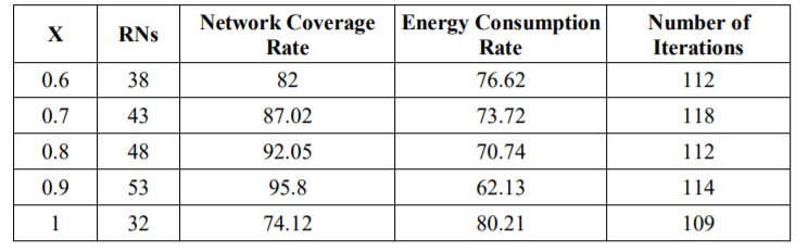 (i) Coverage: the fraction of sensor nodes that can communicate with at least one RN. This value is further multiplied with a weight factor w2. Let 𝑠′ be the number of sensor nodes that can communicate with at least any RN for a given solution. Then, the network coverage rate is computed as follows: