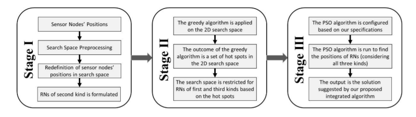 There has also been a number of attempts to develop more effective PSO-based approaches by combining PSO with other algorithms and techniques. In [24], PSO was combined with binary search for addressing the RNP problem in addition to optimizing the number of relay nodes in a single run. The binary search mechanism was used to initially fix the upper bound of the search space and then find for the optimal number of RNs. For every potential output, PSO was applied on the selected number of RNs to find their optimal locations. The best solution is determined according to a fitness function considering a single network performance metric. In [25], PSO was enhanced to discretize the RNP problem and integrate local search. It starts by discretizing the continuous RNP problem with a non-linear fitness function before applying discrete PSO with local search. The local search was used to improve the optimization process at the global level.