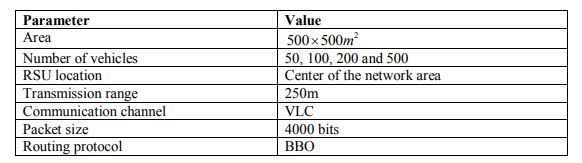 The results and discussion of the proposed RBBO-VLC-VANET are described in this section. The implementation and simulation of the RBBO-VLC-VANET is carried out in the MATLAB R2018a which is operated in the in a Windows 8 operating system with an Intel core i3 processor and 4GB RAM. In this RBBO-VLC-VANET, the VLC is used as a communication channel for supporting the data transmission between the vehicles. The routing path between the source vehicle to the RSU is generated by using the BBO. The number of vehicles deployed in the network area are varied as 50, 100, 200 and 500 which are deployed in the area of 2 m .´500 500 The specification parameters of this RBBO-VLC-VANET method are given in Table 1.