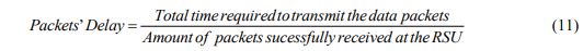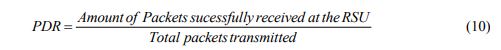PDR is the ratio between the Number of packets successfully received at the RSU to the total packets generate at the source vehicle. Expression for PDR is shown in the equation (10).