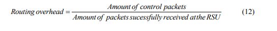 Routing overhead is defined as the ratio between the number of control packets and amount of packets successfully received at the RSU. The routing overhead is expressed in the following equation (12).