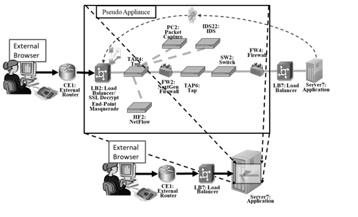 The main contribution of the ELS approach to network defense in a distributed system is in maintaining the inspection process without breaking the end-to-end encryption of communications. The pseudo-appliance captures all of the inspection processes and places them into one software process that resides in the application. This is the first step in realigning the priorities between the current approach and the end-to-end approach, as shown in Figure 10.The path from the user to the application in the top half of the figure shows the processes needed for inspection. Note that the private key for server 7 has been hand passed to the initial load balancer so that the exchange of information is visible. Next, the load balancer decrypts packets for inspection. This includes not only the inspection, but also the necessary reporting.