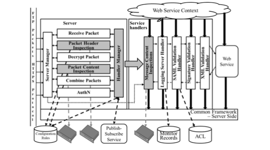Figure 11 shows the handler makeup in the server. The handlers rely upon software only versions of the inspection systems. Software only versions are not always not available. To counter the problem of a potential threat identification, an interface in the handler is provided that allows the handler to sends packets or contents to a hardware appliance version of the inspection for completeness purposes. The application, itself, may await this inspection or proceed with processing, a=depending upon configuration.ELS enhances protection of the application server and provides additional security protections as discussed in the following section.