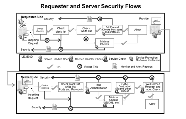 The protection system has the capability to monitor, filter, or shut down traffic to given ports. It scans for malicious code. It examines devices for geo-location, veracity, system login and other elements. It examines incoming and outgoing traffic for anomalies or known exploits. It acts in the security context of the end-point for both requester and provider and examines not only the encrypted traffic but also the clear text traffic for malicious behavior or code. This requires access to the unencrypted traffic as well as the encrypted traffic. The protection system provides most but not all of the checks. Figure 12 walks through checks in an ELS enclave provided by the protection system, the server handlers, the service handlers, and the service itself, minimizing the need for in-line appliances.