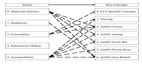 The key concepts are based on the tenets and address specific architectural decisions that relate to the requirements. These are likely to be similar to the ELS concepts for many security-based systems, but different for projects with other goals. The concepts form a bridge between the high-level tenets and the technical requirements by describing the high level system in a way that maps to the tenets. The complete list of ELS Key Concepts is provided in [7. 8]. A subset of the ELS concepts follows: