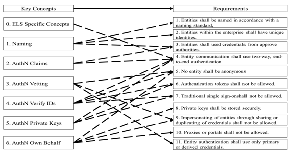 The ELS-specific concepts are a collection of important protocols and standards that are to be used across the enterprise. Although each of these could be taken individually as a requirement, they together form such an important part of the ELS model that they are elevated to the level of a concept. The other concepts listed all relate to authentication, which is an important part of the ELS model.