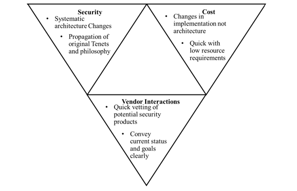 A third benefit of using this model is dealing with vendors. This basic model provides an architecture for the system into which vendor products can fit. The alternative is to adjust the architecture to fit available vendor product suites. Vendors will often sell a product that is a collection of smaller pieces, and then slowly add more pieces in an effort to integrate all functions under their product suite. This is convenient and efficient in many cases, but it locks the system architecture to a particular vendor and product, which can cause problems when enterprise needs and vendor product functionality diverge. The explicit mapping of the basic security model and choice of widely used protocols and standards maintains a focus on functions instead of products.