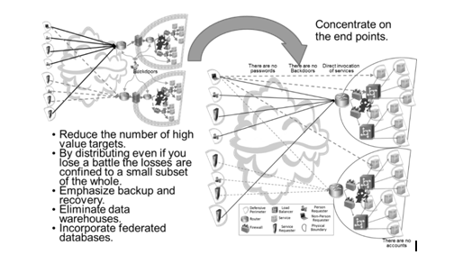 Many of the new approaches to security have moved to a distributed security approach. The ELS framework has evolved from a fortress approach, in which the assumption that the threat is stopped at the front door, to a distributed security system that eliminates or mitigates many of the primary vulnerability points inherent with that system, as shown in Figure 9. The basic process of identification involves a two-way contract between two entities that are initiating a communication. Each entity needs to have some assurance that the entity they are engaged with is a known entity and, specifically, the one to whom the communication should be allowed. The presentation of claims by each entityis verifiable and validateable. These claims are often in the form of credentials. [7, 8] provide an extensive description of these processes. However, it is this distributed approach and the requirement for content inspection and reporting that causes the conflict between this approach and the traditional fortress representation.