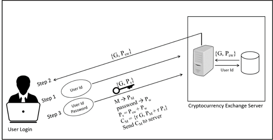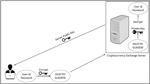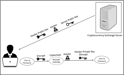 Man-in-the-middle (MITM) attack is a very serious concern for cryptocurrency exchanges as their user accounts are deemed huge honey pots for hackers. In a MITM attack, a hacker positions himself between an account user’s computer and the exchange server [1]. One viable technique of MITM attack is key spoofing wherein the attacker intercepts the public key of the server and replaces it with his public key. Unaware of the attack, the user encrypts his account password during login with the attacker’s fraudulent public key and submits the ciphertext to the exchange server. As the attacker has already positioned himself between the user and the server, he intercepts the ciphertext and decrypts it with his matching private key that will exactly decrypt the password to its original plain text [2]. The stolen password is used later for stealing crypto assets from the account.