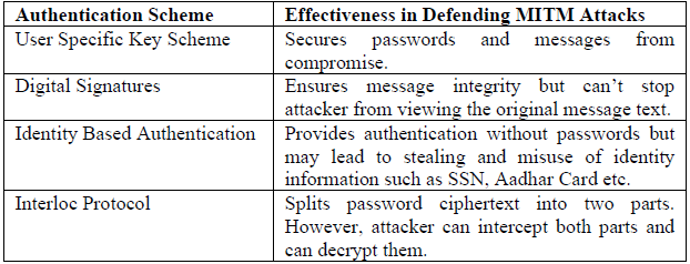 The following table shows the effectiveness of different authentication methods, including the User Specific Key Scheme, in defending user accounts against MITM attacks.
