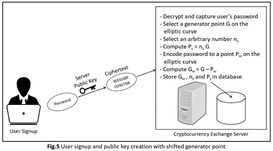When a user signs up for a new account on the server, he fills in his user id and password and submits the form which passes the encrypted credentials to the server. Fig.5 below illustrates capturing the user’s password, creating his key pair and shifting the generator backward by the password.