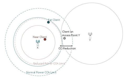 10. Power reduction: AP1 will reduce transmitted power for its near client (client1), which will potentially reduce CCI for its distant client (client2).