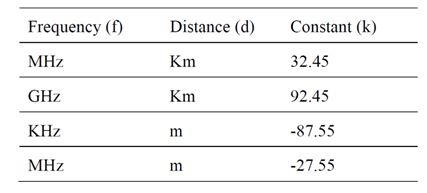 FSPL(dB) = 20log(d) + 20log(f) + K (1)