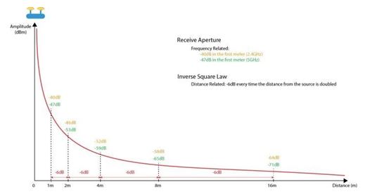 which is determined by free-space path loss (FSPL). Free space path loss affects not only WiFi but all radio transmissions. It refers to the quantity of power lost by a signal traveling away from its transmitter [25]. There are two factors considered in the calculation of FSPL, which are radio frequency (f) and distance from the source (d). For this specific formula, a constant of free space, or open-air, is assumed. The value of the constant depends on the units of measurement used for (f) and (d). For example, when (d) is measured in kilometers and (f) in gigahertz, the value of the constant is 92.45, and when (d) is in kilometers and (f) is in megahertz, the value is 32.45, and there are other values as seen in [27, Table 1]. There are also variations for other media, such as traveling through water and different obstacles of varying densities such as walls and windows. In summary, the loss is not linear, and it is greater when there are obstacles present. It is also notable that higher frequencies suffer higher losses; therefore, a 2.4 gigahertz signal can travel farther away than a five gigahertz signal. As illustrated in [25, Figure 9], the signal loses 6 decibels whenever its distance from the source is doubled.