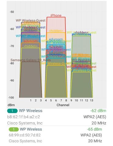 [1] [3] [4]. There are two types of surveys that can be performed when designing and deploying a wireless network. The initial site survey is performed before deployment, and it aids in identifying the best design to address coverage and demand. In contrast, the post-deployment survey uses statistics to validate and verify the already-deployed network [1] [2]. These site surveys are accomplished through the use of different tools such as Ekahau, Acrylic WiFi, and NetSpot products [7] [8] [9]. Large wireless designs require multiple APs that are arranged to ensure adequate coverage with no dead zones by creating slightly overlapping coverage areas [2]. In these surveys, the physical layout and even the furniture of the building in which the wireless network is going to be deployed are taken into consideration [2]. Using these tools, a plan can be developed by walking throughout the floor plan to identify walls, obstacles, glass divisions, and also recognize WiFi traffic, dead zones, and the best locations for APs[7] [8] [9]. Furthermore, if these APs are too close to each other and on the same channel, they will cause CCI. Similar to avoiding non-WiFi interference, wireless APs can have their channels selected manually or dynamically by using algorithms that avoid configuring adjacent APs to use the same channel. That solution is not always adequate since the regulating agencies are only able to provide a finite number of channels to use [10], as illustrated in [11, Figure 1]. For example, as seen in [12, Figure 2], for channels with a range of 22MHz in the 2.4GHz band, there is only sufficient space for channels one, six, and eleven, so they must be reused while avoiding interference. To avoid these interferences, protocols such as CSMA/CA and request to Send/Clear to Send (RTS/CTS) help avoid frame collision [13] [14]. There are also documented solutions, such as “Look Who’s Talking (LWT), that allow for arbitrary schedules to be distributed to nodes in a WiFi network” [13, p.1], as well as most modern solutions such as beamforming [15], and multiple-input multiple-output technology [16], all of which are out of the scope of this paper.